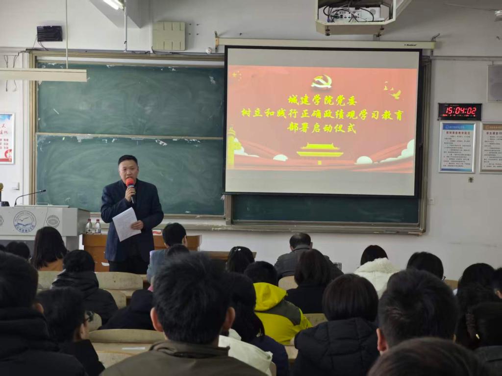 2026年3月12日下午,城建学院召开全体教职工大会,深入学习贯彻习近平总书记关于树立和践行正确政绩观的重要讲话和重要指示精神,传达学习中央党的建设工作领导小组会议精神及学校党委部署要求,全面启动学院树立和践行正确政绩观学习教育。学院党委书记赵建平主持会议并作动员讲话。